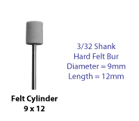 9x12 Cylinder Quantity in Basket: none Code: FELT-CYL-9x12 Price: $3.00 Shipping Weight: 0.05 pounds Sorry, we are currently sold out of '9x12 Cylinder'. Please check back later. 9m x 12mm Cylinder Felt Bur