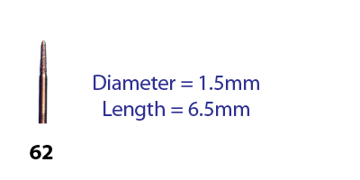 The 62 Fine Porcelain Veneer Diamond Bur is used when working on short teeth or in a confined area. This bur is used to place a subtle chamfer at the gingival and proximal margins. It is also used to establish the three labial planes. ~ Regular Price $5