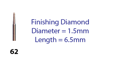 "The 62 X-Fine Porcelain Veneer Diamond Bur is used on short teeth or when working in a confined area. It is used to produce a smooth finish on the enamel surface when desired. ~ Regular Price $6.95 Each ~ Available in Standard Friction Grip, Short Shank,"