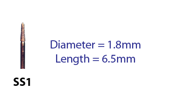 "SS1 Friction Grip Diamond Bur ~ Regular Price $6.95 each ~ Available Grits: X-Coarse, Coarse, Fine, X-Fine, Ultra Fine ~ Available in Standard Friction Grip, Short Shank, or Ultra Short Shank"