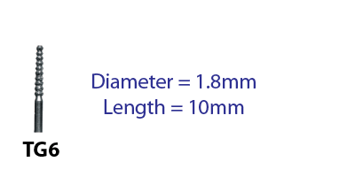 TG6 FG Quantity in Basket: none Code: TG6-FG Price: $5.95 Shipping Weight: 0.01 pounds Grit:: Coarse Shank Size:: Standard Friction Grip Short Shank Friction Grip Ultra Short Shank Friction Grip Quantity: "TG6 Friction Grip Diamond Bur ~ Regular Price $6.95 each ~ Available Grits: Coarse ~ Available in Standard Friction Grip, Short Shank, or Ultra Short Shank"