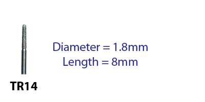 "TR14 Friction Grip Diamond Bur ~ Regular Price $6.95 each ~ Available Grits: X-Coarse, Coarse, Fine, X-Fine, Ultra Fine ~ Available in Standard Friction Grip, Short Shank, or Ultra Short Shank"