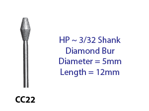 CC22 Quantity in Basket: none Code: CC22-HP Price: $7.25 Shipping Weight: 0.05 pounds Grit:: X-Coarse Coarse Fine X-Fine Ultra Fine Quantity: "CC22 Laboratory Diamond Bur ~ 3/32"" Shank ~ Regular Price $8.75 Each ~ Available Grits: X-Coarse, Coarse, Fine, X-Fine, and Ultra Fine"